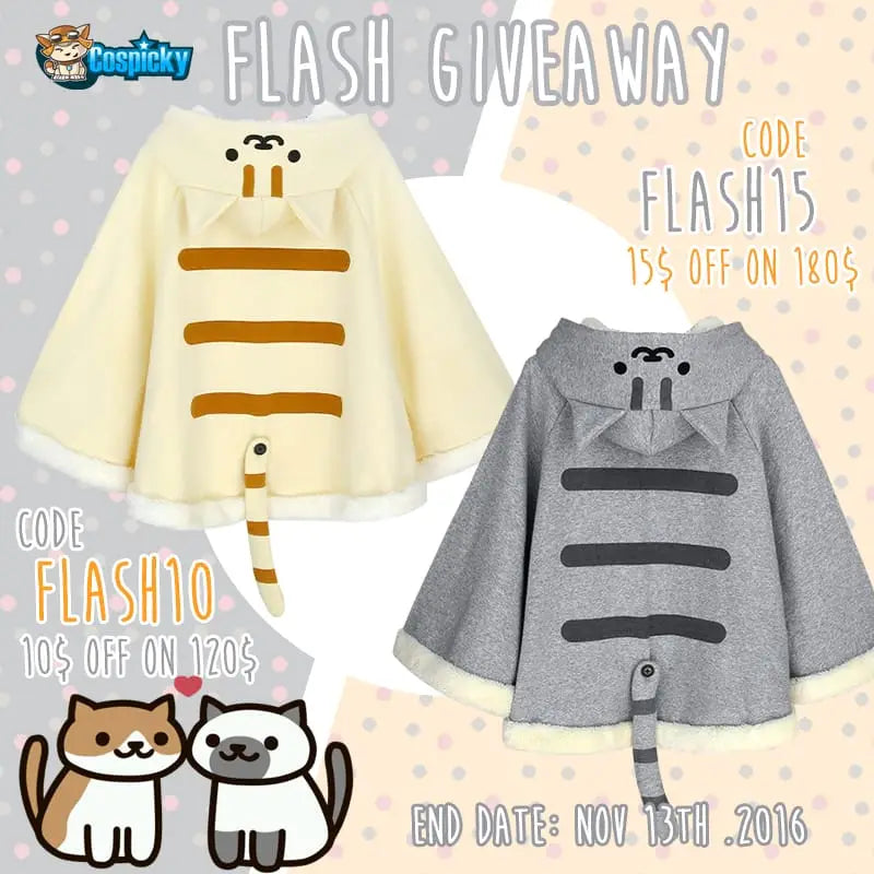 ----- Flash Giveaway ----- Prize : One Neko Atsume Cape #ForFree! 2 winner will be picked up on @Cospicky Instagram Enter from Instagram 1 winner will be picked up on @Cospicky Facebook Enter from Facebook ----- Flash Sale ! ----- Code: Flash10 10$ OFF ON 120$ Code: Flash15 15$ OFF ON 180$ Ends date: Nov 13th,.2016 Good luck <3 Cospicky Team
