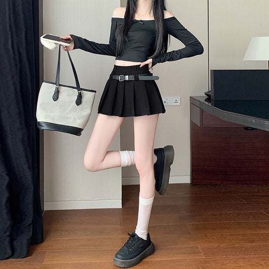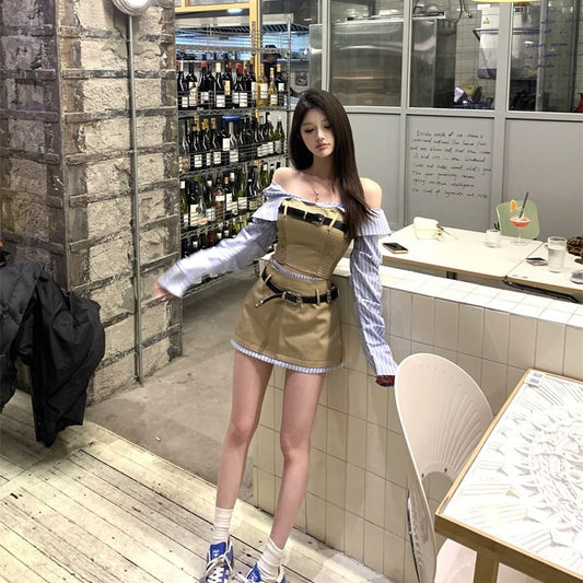 A-Line Panel Smocked Striped Two-Piece Waist Off-Shoulder Crop Blouse Long-Sleeve Belt Mini High Set Skirt Mock /