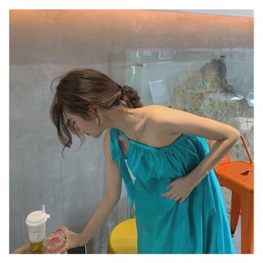 Spaghetti Strap Asymmetrical Plain Ruffled Midi A-Line Dress