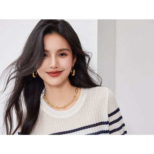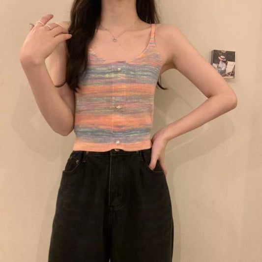 Striped Faux Pearl Button Knit Crop Camisole Top