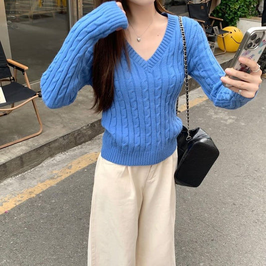 V-Neck Plain Cable Knit Sweater / High Waist Wide Leg Pants