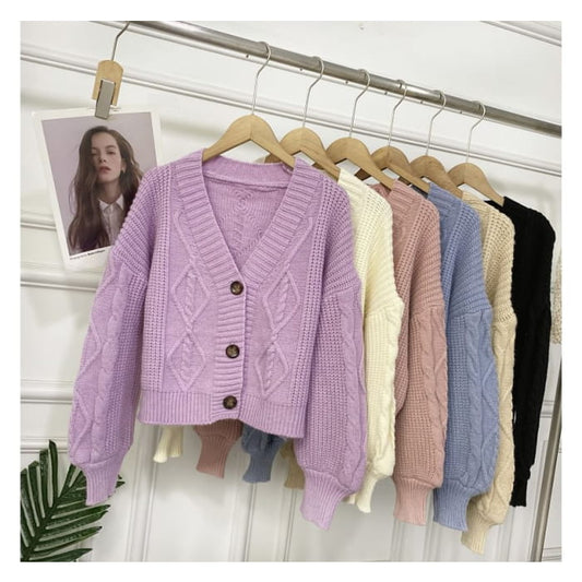 V-Neck Plain Button-Up Cable Knit Cardigan