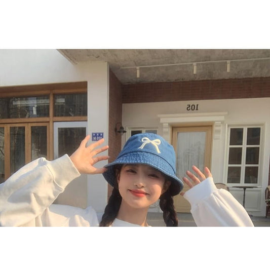 Bow Embroidered Denim Bucket Hat