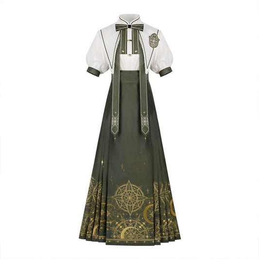Bowknot Decor Shirt Green Vintage Print Pleated Skirt