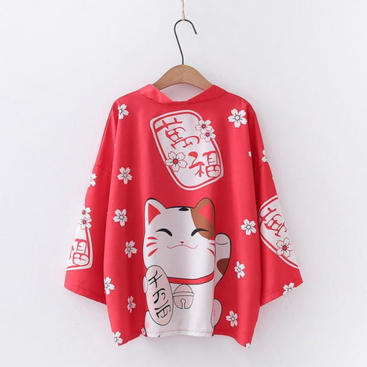 Charming Lucky Cat Sakura Print Loose Outerwear Kimono