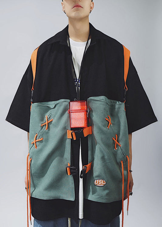 Chic Shirts Up Cotton Khaki Men Patchwork Lace Sleeve T Half