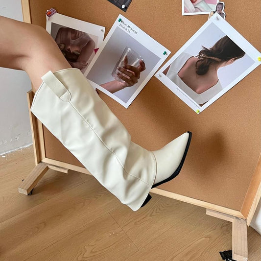 Chunky Heel Pointed Toe Plain Faux Leather Tall Boots