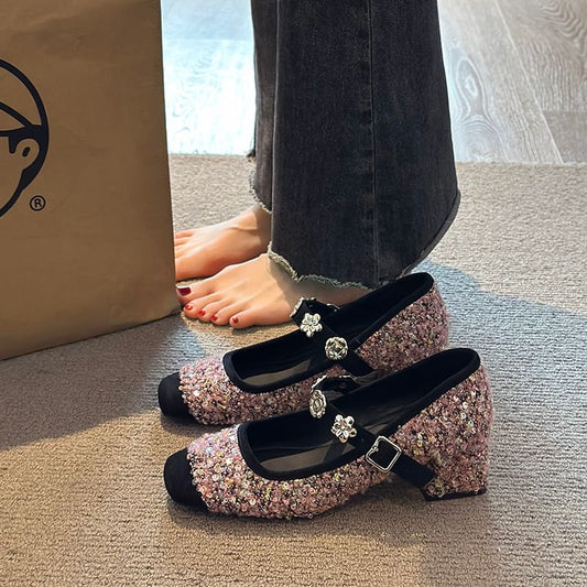 Chunky Mary Heel Metal Accent Sequin Jane Pumps