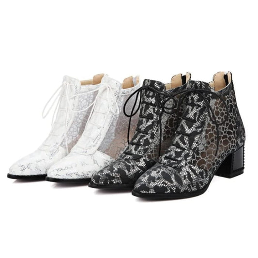 Chunky Heel Snake Skin Print Mesh Panel Lace