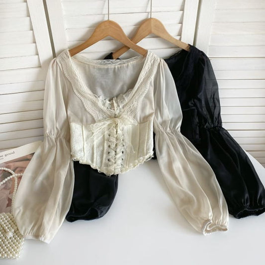 Cinched Sleeve Square Neck Plain Lace Up Panel Lace Blouse