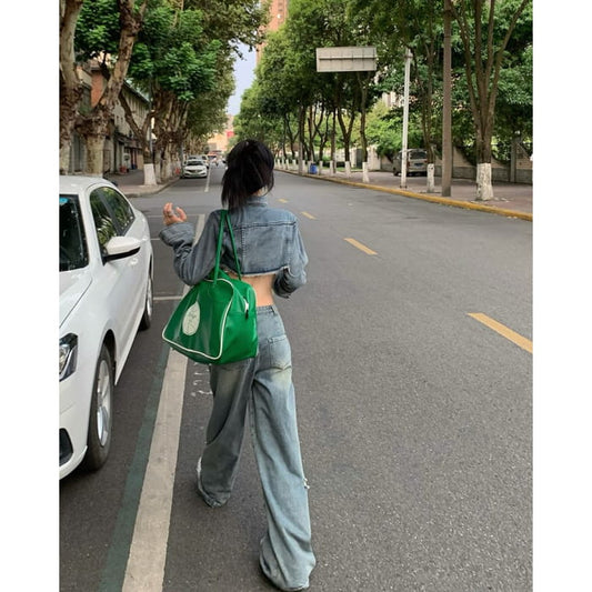 Collar Asymmetrical Fringed Washed Denim Crop Jacket / Mid Rise Distressed Wide Leg Jeans / Set