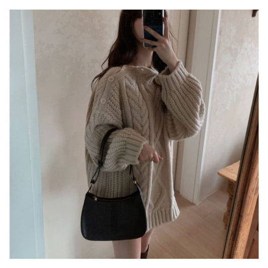 Crew Neck Button Cable Knit Sweater