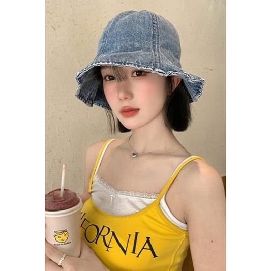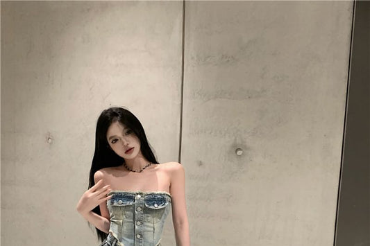 Denim Fit Button-Up / High Washed Rise Ripped Tube Crop Jeans Loose Top Frayed