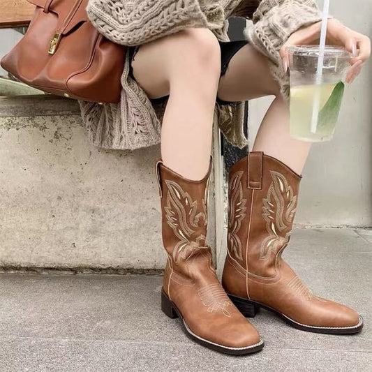 Embroidered Trim Chunky Heel Wide-Calf Mid Calf Boots