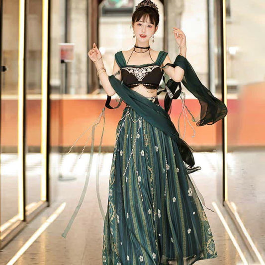 Fascinating Embroidery Top Pearl Chain Decor High Waist Skirt
