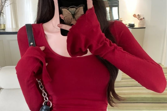 Flared-Sleeve Scoop Neck Plain Lettuce Edge Tee