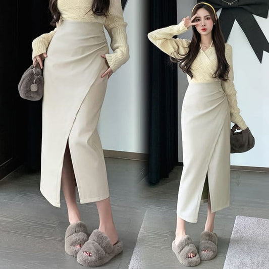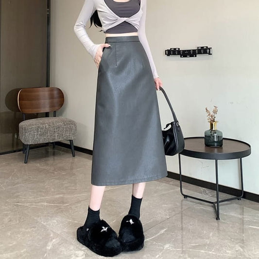High Rise Plain Faux Leather Slit Midi Pencil Skirt