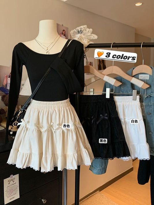 High Rise Plain Bow Lace Trim Mini A-Line Skirt