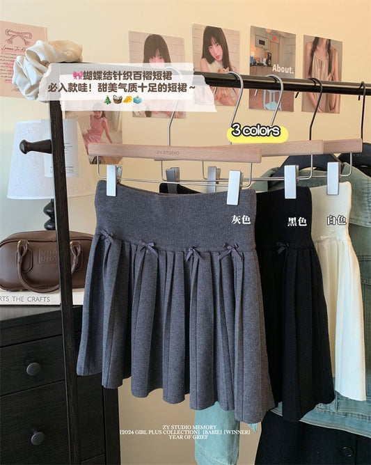 High Rise Plain Bow Accent Pleated Knit Mini A-Line Skirt