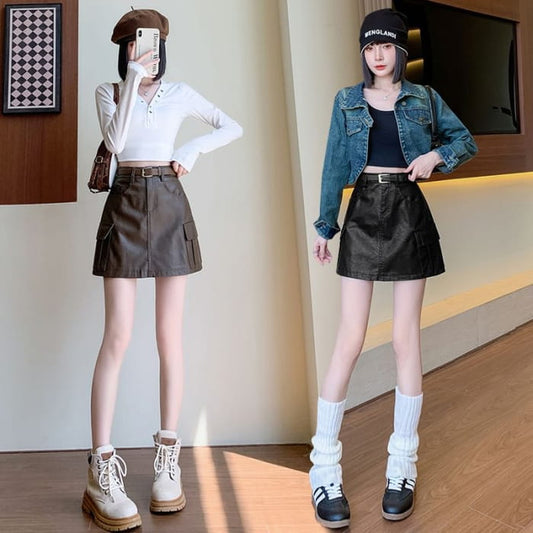 High Rise Plain Faux Leather Mini A-Line Skirt