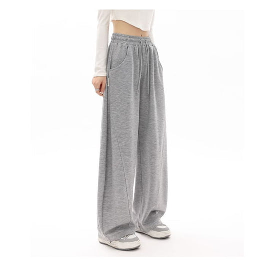 High Waist Plain Pocketed Drawstring Wide Leg Sweatpants