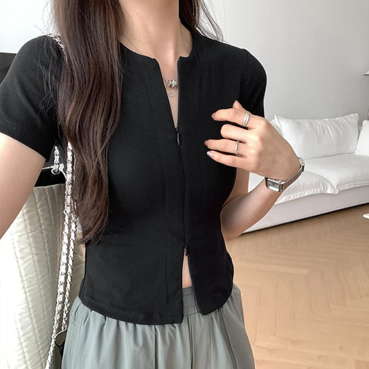 Knit Top Plain Shoulder Ribbed Off Short-Sleeve