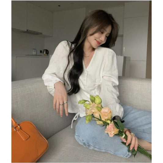 Long-Sleeve V-Neck Plain Ruched Button-Up Blouse