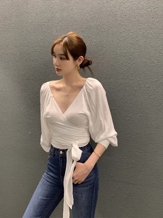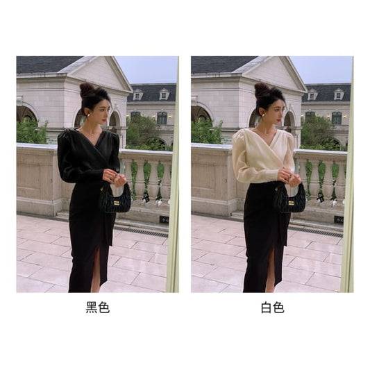 Long-Sleeve V-Neck Plain Tie Back Wrap Blouse