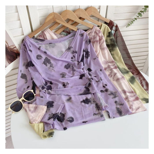 Long-Sleeve V-Neck Print Asymmetrical Mesh Top