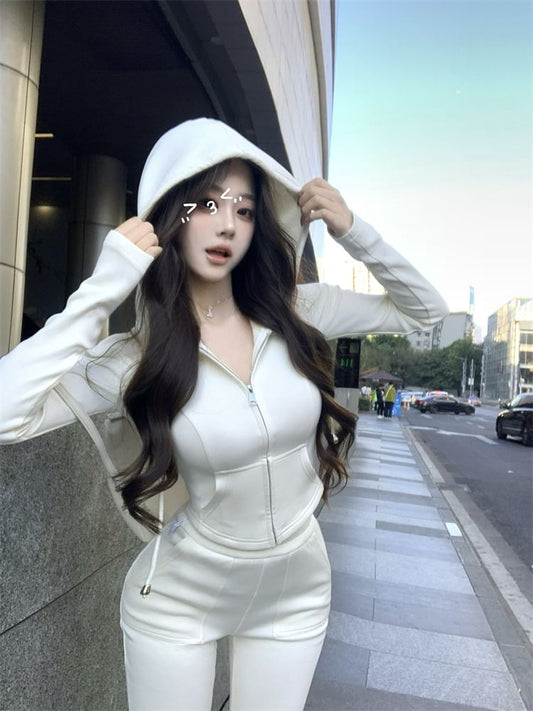 / Flared High Zip Crop Hoodie Plain Sweatpants Waist
