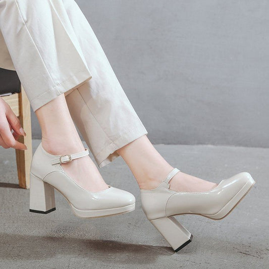 Mary Jane Heel Shoes T Pointed Pyramid Strap