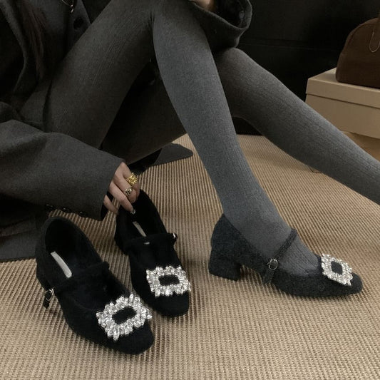 Mary Pumps Square Toe Rhinestone Jane Block Heel Buckled