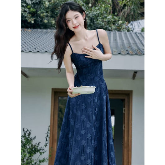 Plain Cardigan / Spaghetti Strap Flower Embroidered Maxi A-Line Dress / Set