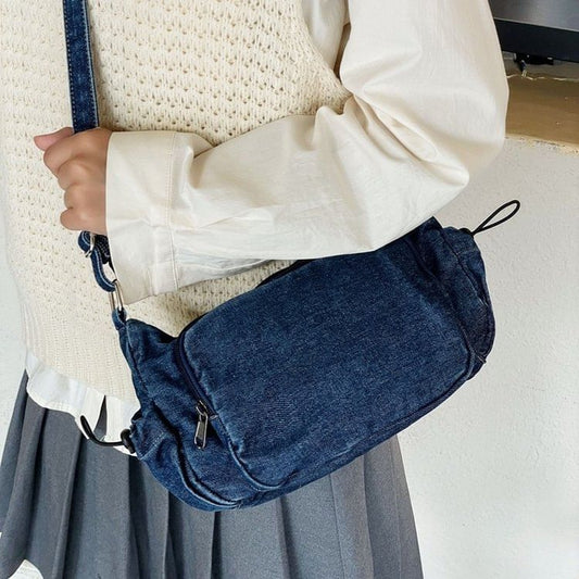 Multi-Pocket Drawstring Denim Crossbody Bag