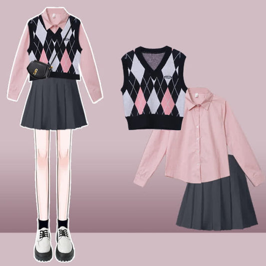 Pink Rhombus Print Vest Long Sleeve Shirt Pleated Skirt