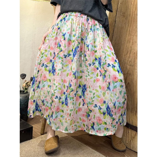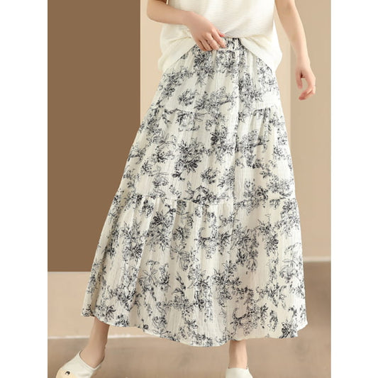 Women Summer Artsy Floral Dual-layer Ramie Skirt BN1041