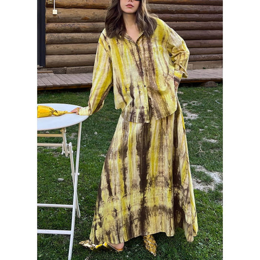 Fitted Purple Peter Pan Collar Tie Dye Shirts And Maxi Skirts Two Piece Set Long Sleeve VB1041