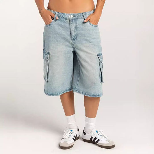 Shorts Pocket Waist Washed Low Straight-Leg Denim