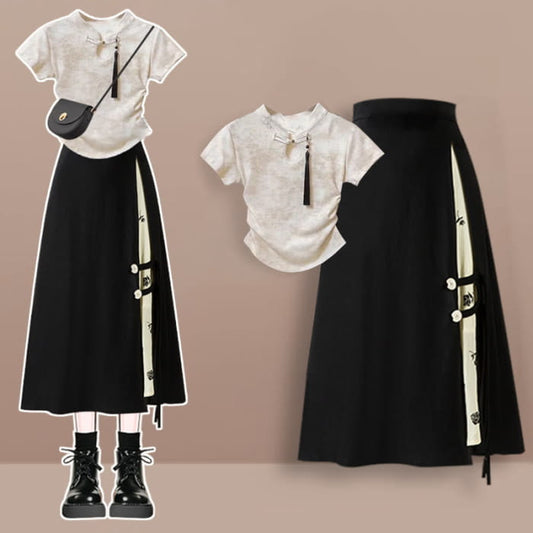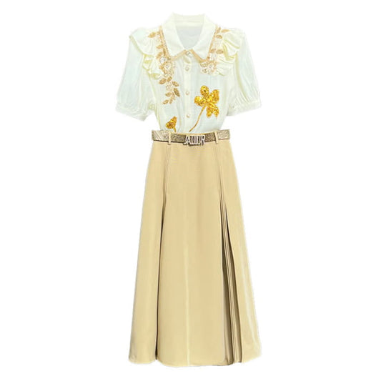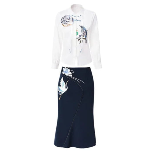 Elegant Floral Tassel Shirt Bird Print Skirt Set