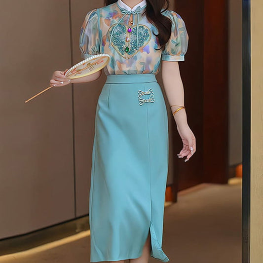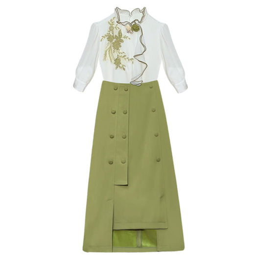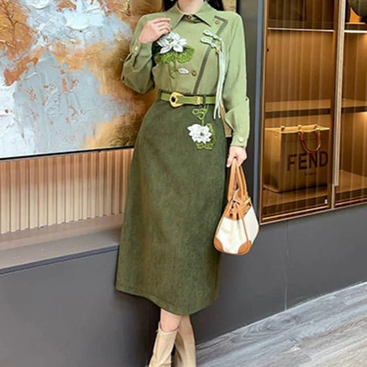 Green Flower Tassel Shirt Blossom Print Skirt Set