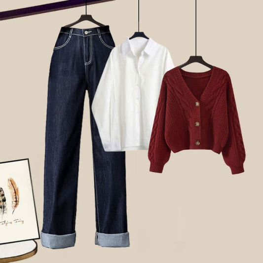 Red Cardigan Sweater Lapel Shirt Denim Pants Set