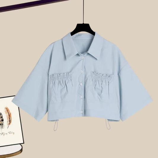 Blue Drawstring Pocketed Polo T-Shirt Split Pantskirt