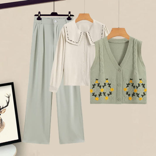 Vintage Embroidery Coat Green High Waist Pleated Skirt