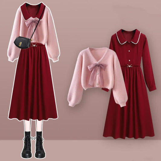 Pink Bow Knot V-neck Cardigan Sweater Slip Dress Set