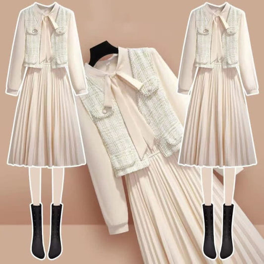 Plaid Print Pearl Vest Lace Up Long Sleeve Pleated Shirt Dress