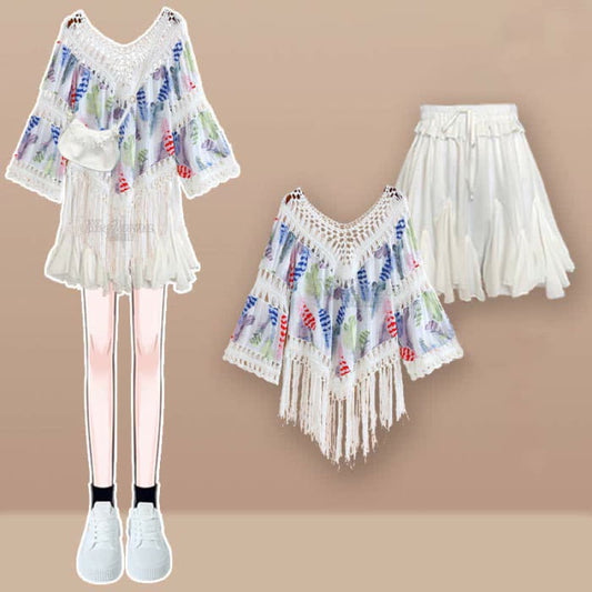 Sweet Boho Print Fringed Hollow Out Shirt Pleated Skirt Slip Dress