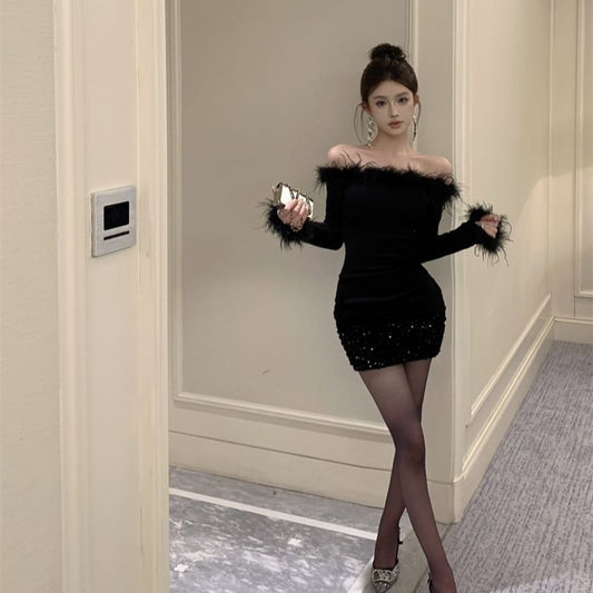 Mini Long-Sleeve Dress Sequin Off-Shoulder Trim Sheath Plain Fluffy