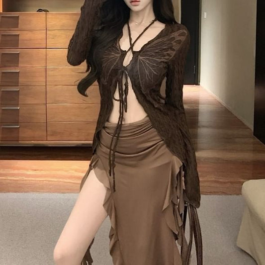 Ruffle Sleeve Trim Dress Butterfly V-Neck / Strapless Print Tie Long Front Top Bodycon Midi Plain
