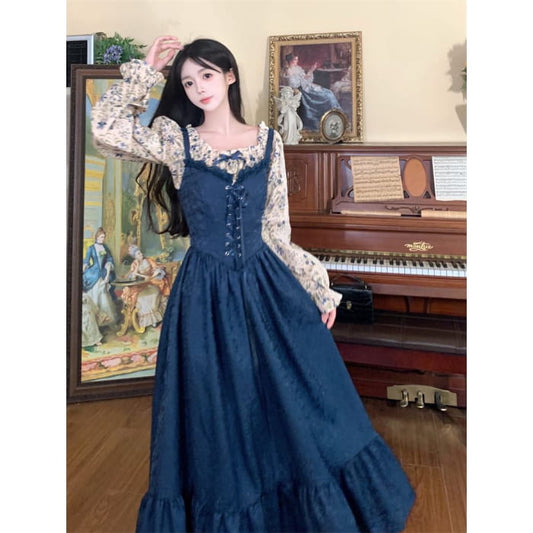Long-Sleeve Square Neck Floral Blouse / Spaghetti Strap Lace Up Midi A-Line Dress