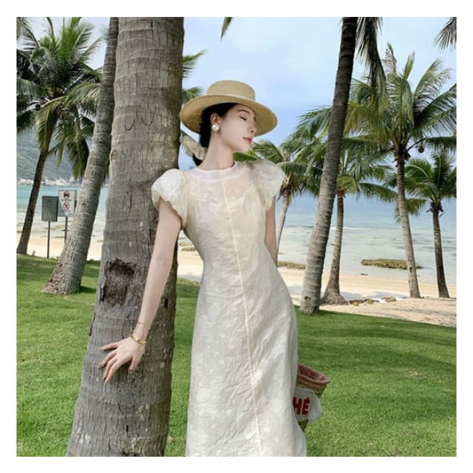 Puff-Sleeve Plain Drawstring Floral Print Open Back Midi Sundress